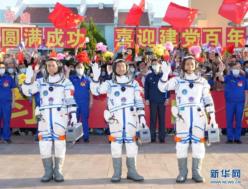 6月17日,神舟十二號航天員出征儀式在酒泉衛(wèi)星發(fā)射中心舉行。這是航天員聶海勝(右)、劉伯明(中)和湯洪波在出征儀式上揮手。
