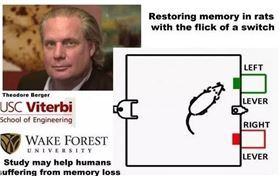 頑皮博士在老鼠身上做了實驗,訓練老鼠學會簡單的技能,然后注射了阻斷長期記憶的藥物,讓老鼠忘了“剛才發生了神馬事?”然后把“記憶芯片”植入老鼠的海馬體,用簡單的記憶編碼釋放脈沖信號,神奇啊神奇,老鼠的技能恢復了...