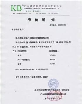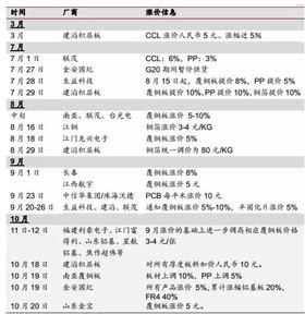 據了解,從3月份建滔領先漲價以后,7月份聯茂、建滔再次對覆銅板漲價,到了8月份,南亞、聯茂、太廣電等覆銅板大廠正式漲價5%~10%,其中南亞還會根據市場情況進行平均每兩個月進行一次調價,9月份,生益科技、建滔和聯茂繼續發布通知漲價,10月份以后,線是中小覆銅板廠商在9月份漲價的基礎上進行調高相關覆銅板價格3~4元/張,隨后建滔再次表示,對所有的厚度板料增加人民幣10元,在此之后,金安國紀、山東金寶也跟著發布漲價通知,漲幅在5%~10%之間。